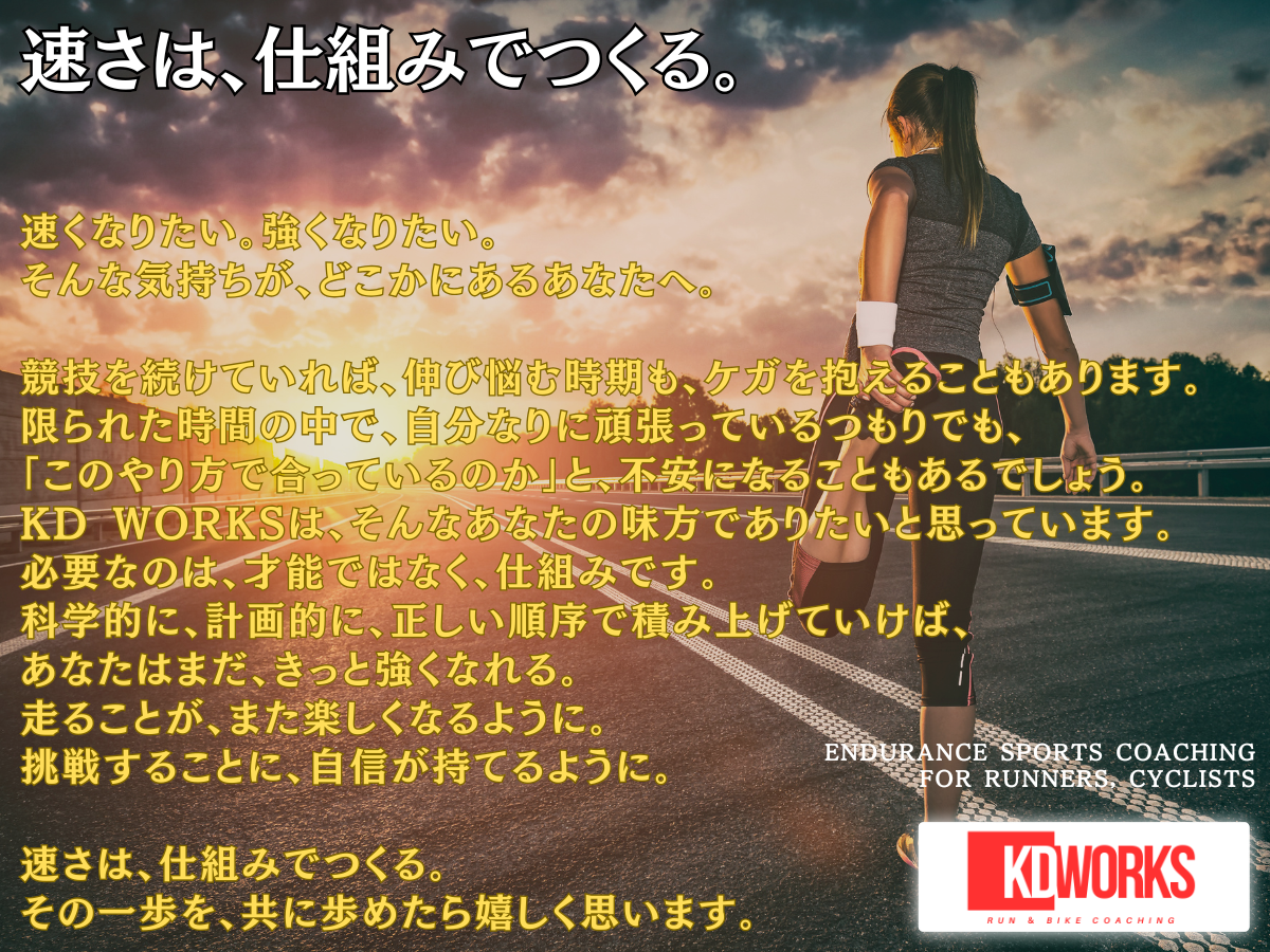 一昨年からモニター生徒の協力を得て、実践的なコーチングを試み、多くの成果と学びを得ることができています。2026年から『KD WORKS』として、ランニングや自転車競技に特化した本格的なコーチングをスタートさせる予定です。現在、その実現に向けてさらに知識と経験を磨いています。