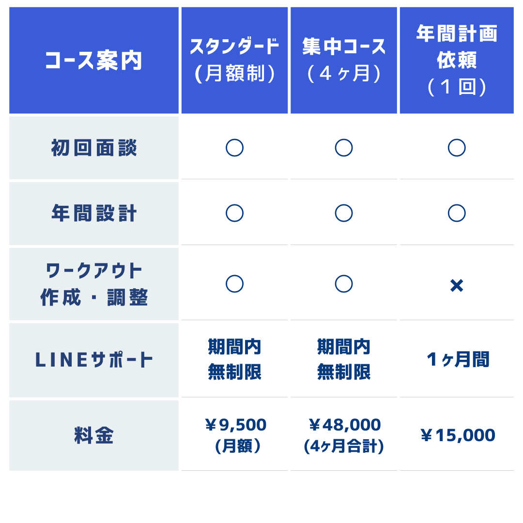 年間計画に基づいて段階的にワークアウトを作成。ライフスタイルや進捗に応じた柔軟な調整+LINEサポートついた安心の長期コース。
