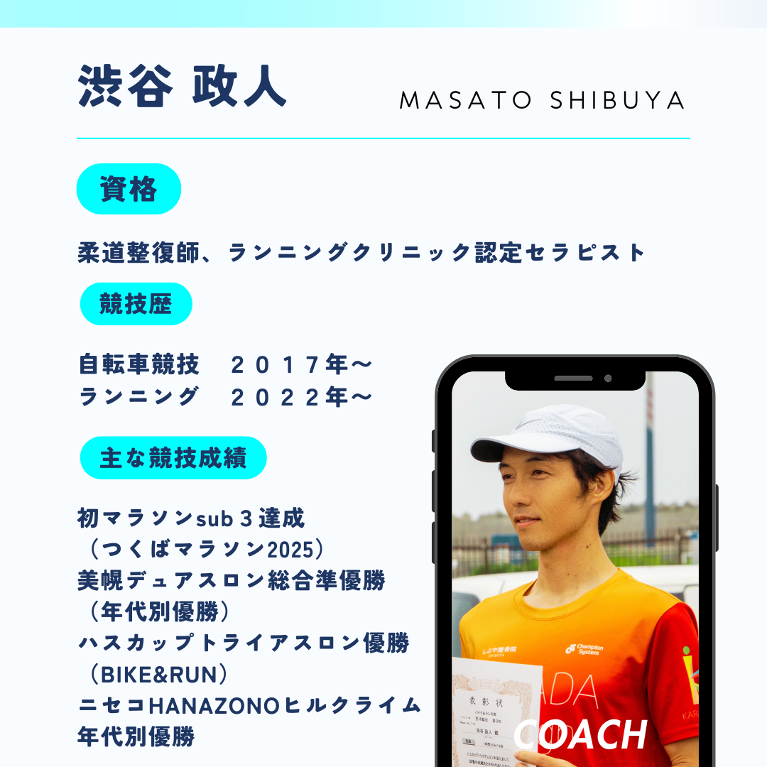 ランニングはケガが多い運動ですが、頻繁にケガをしてトレーニングが停止されていてはどんなにポテンシャルがあっても成長しません。私は柔道整復師という身体の専門家でありながら、ランニング障害に関しての専用資格も所持しています。それらの知識を計画に活かしてケガが多い選手に対して、しっかりと対応していきます。